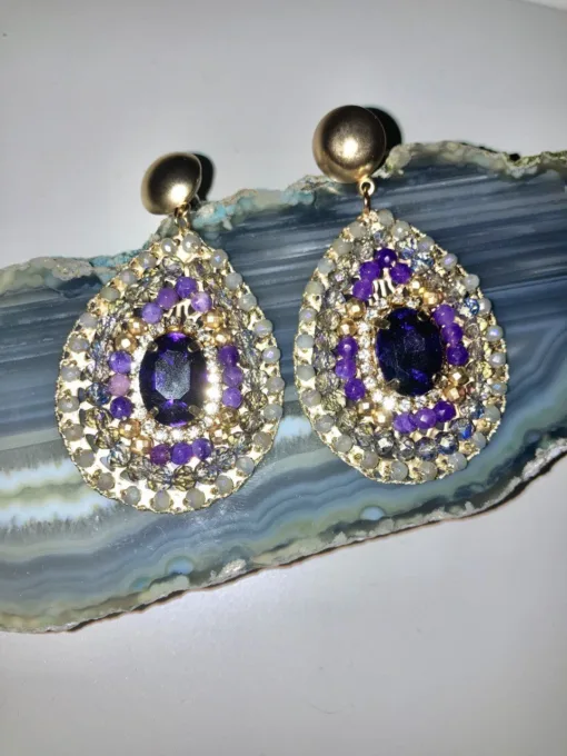 Mooie gouden oorbellen met paars/licht grijze kleine kraaltjes en strass stenen.